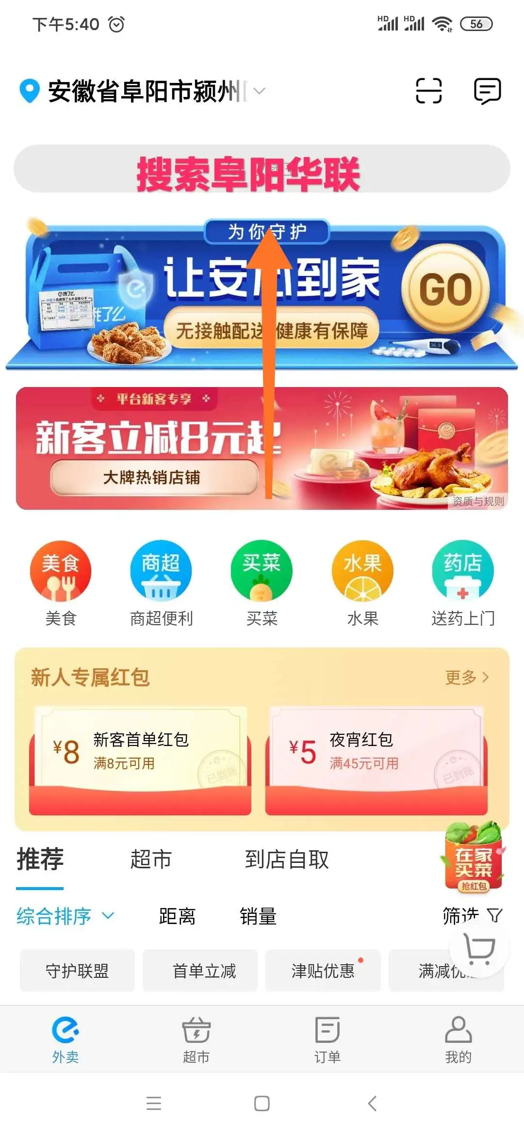 ①掃碼下載餓了么并搜索“阜陽(yáng)華聯(lián)”