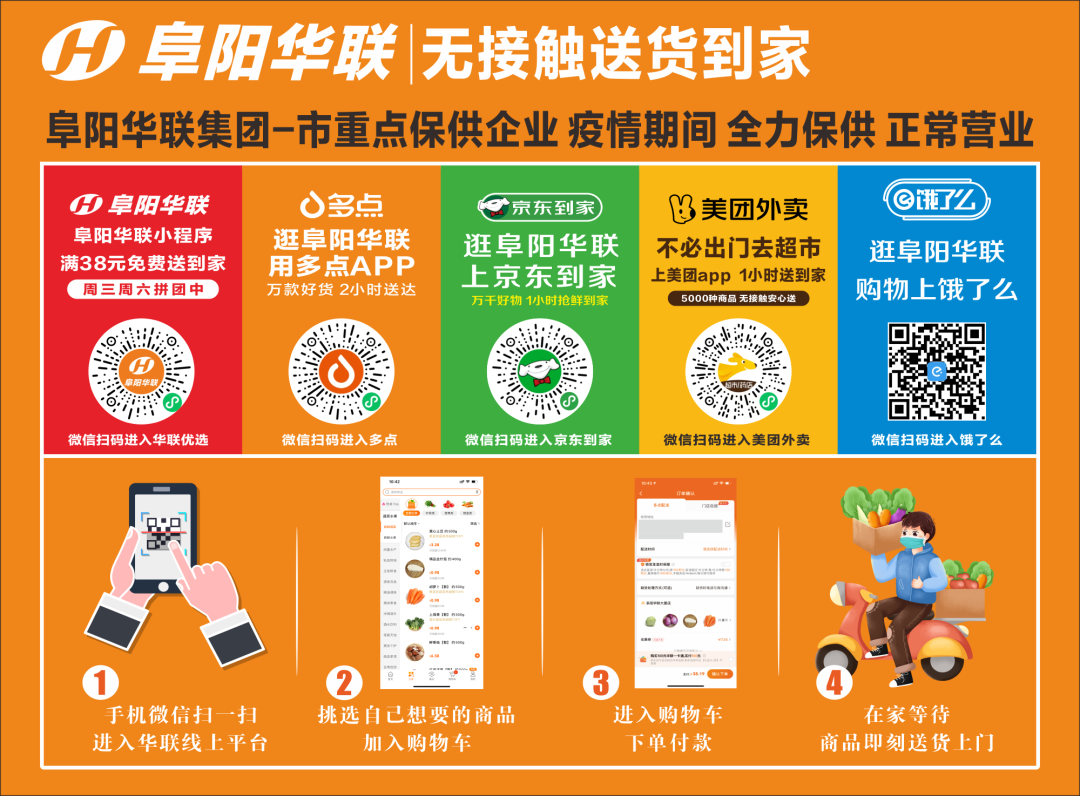 在滿(mǎn)足市民到店采購需求的同時(shí),阜陽(yáng)華聯(lián)各門(mén)店積極向周邊社區提供到家服務(wù),顧客可通過(guò)阜陽(yáng)華聯(lián)優(yōu)選小程序、多點(diǎn)平臺、京東到家、美團外賣(mài)、餓了么等線(xiàn)上平臺下單,門(mén)店員工揀貨、裝袋、打包后,多種舉措確保居民更安全便捷、無(wú)接觸配送,多舉措滿(mǎn)足轄區居民線(xiàn)下線(xiàn)上購物需求。