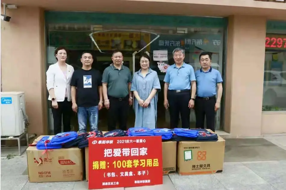 阜陽(yáng)華聯(lián)集團為孩子們送來(lái)了書(shū)包、文具盒、本子等學(xué)習用品100套。