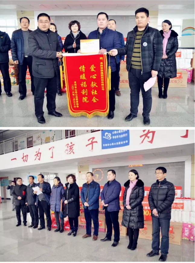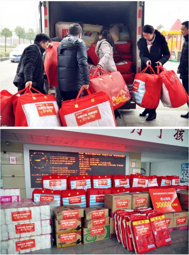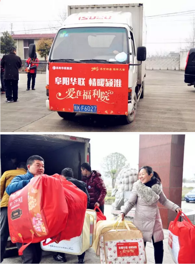 春節到,情意濃!2016年1月30日一大早,阜陽(yáng)華聯(lián)集團工會(huì )主席周軍、副總經(jīng)理張曉東、總經(jīng)理助理李俠,在阜陽(yáng)市婦聯(lián)主席郭琳、市民政局副局長(cháng)馬愛(ài)、潁東民政局副局長(cháng)湯曉、阜陽(yáng)新聞網(wǎng)總編輯魏飛一行的陪同下,帶著(zhù)滿(mǎn)滿(mǎn)一大車(chē)的棉被、生活用品等價(jià)值3萬(wàn)元的慰問(wèn)品,來(lái)到了阜陽(yáng)市社會(huì )兒童福利院,為孩子們送去了新春祝福,溫暖了整個(gè)兒童福利院。