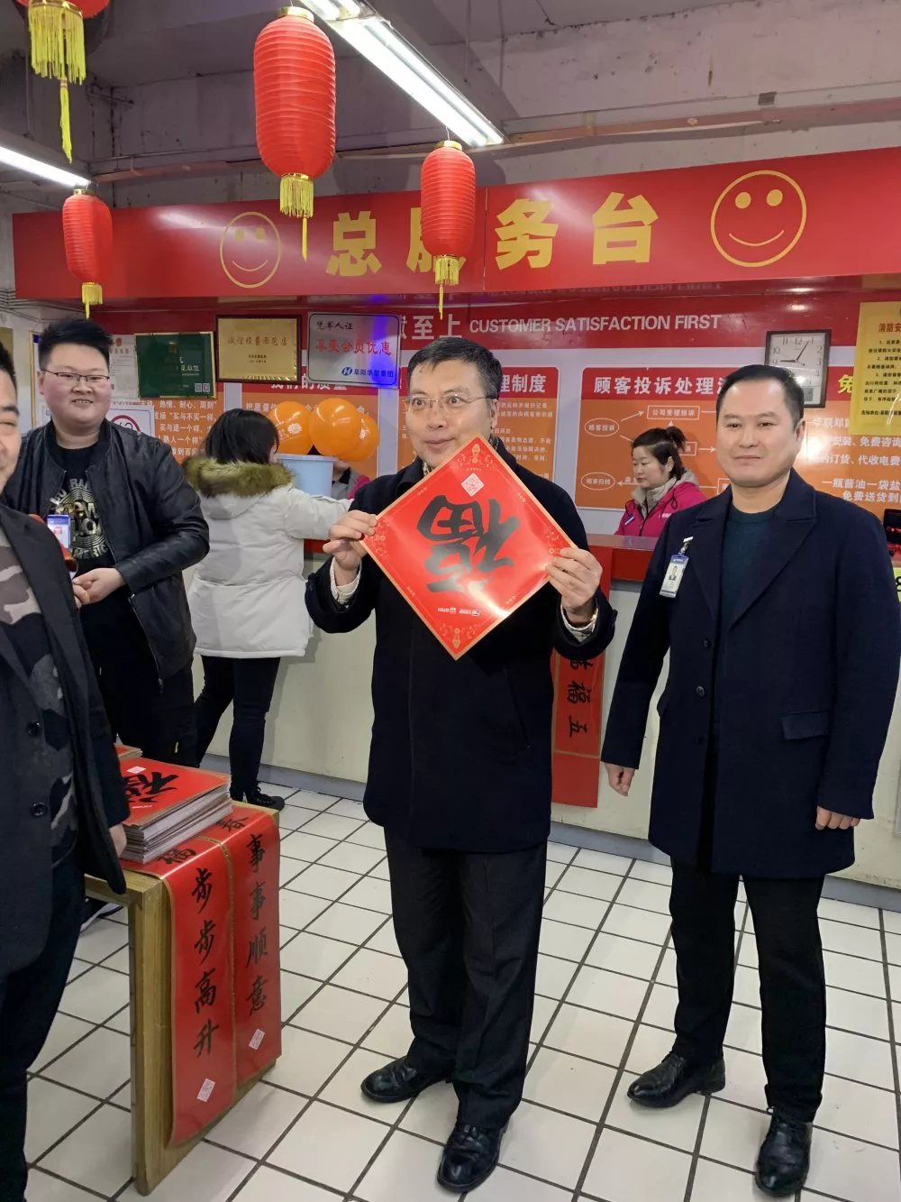 劉市長(cháng)在看到超市正在“為民送?!苯o顧客送福字春聯(lián)的場(chǎng)景后,高興的贊揚了我超市此舉不僅方便了廣大群眾,也是弘揚了中華傳統文化,并用此“?!眰鬟_了對全公司、全市人民新年的祝福!