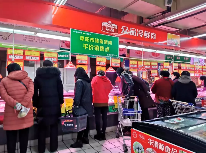 阜陽(yáng)華聯(lián)大廈店柜臺 前圍滿(mǎn)了選購平價(jià)豬肉的市民 不忘初心,不負使命 是阜陽(yáng)華聯(lián)肩負的責任??!