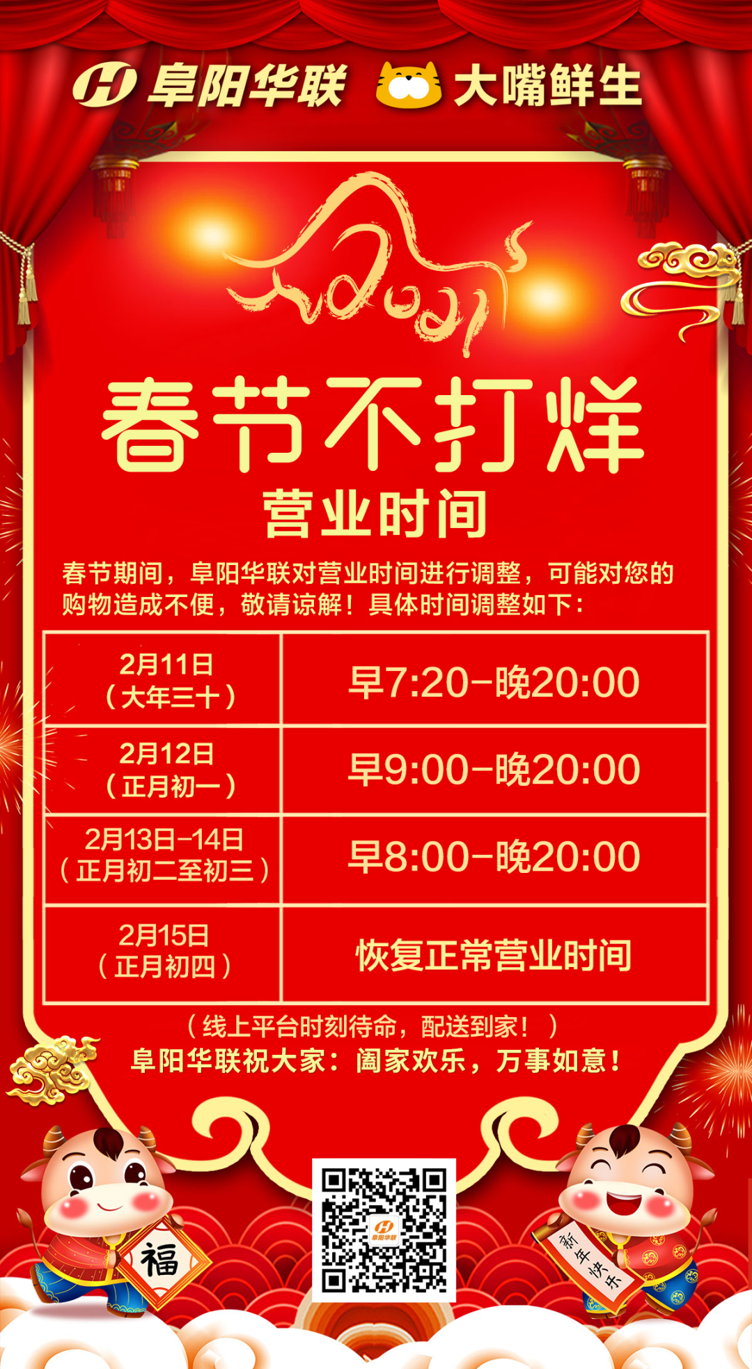 門(mén)店于2月11號(除夕)至2月14號(初三)營(yíng)業(yè)至晚20點(diǎn),