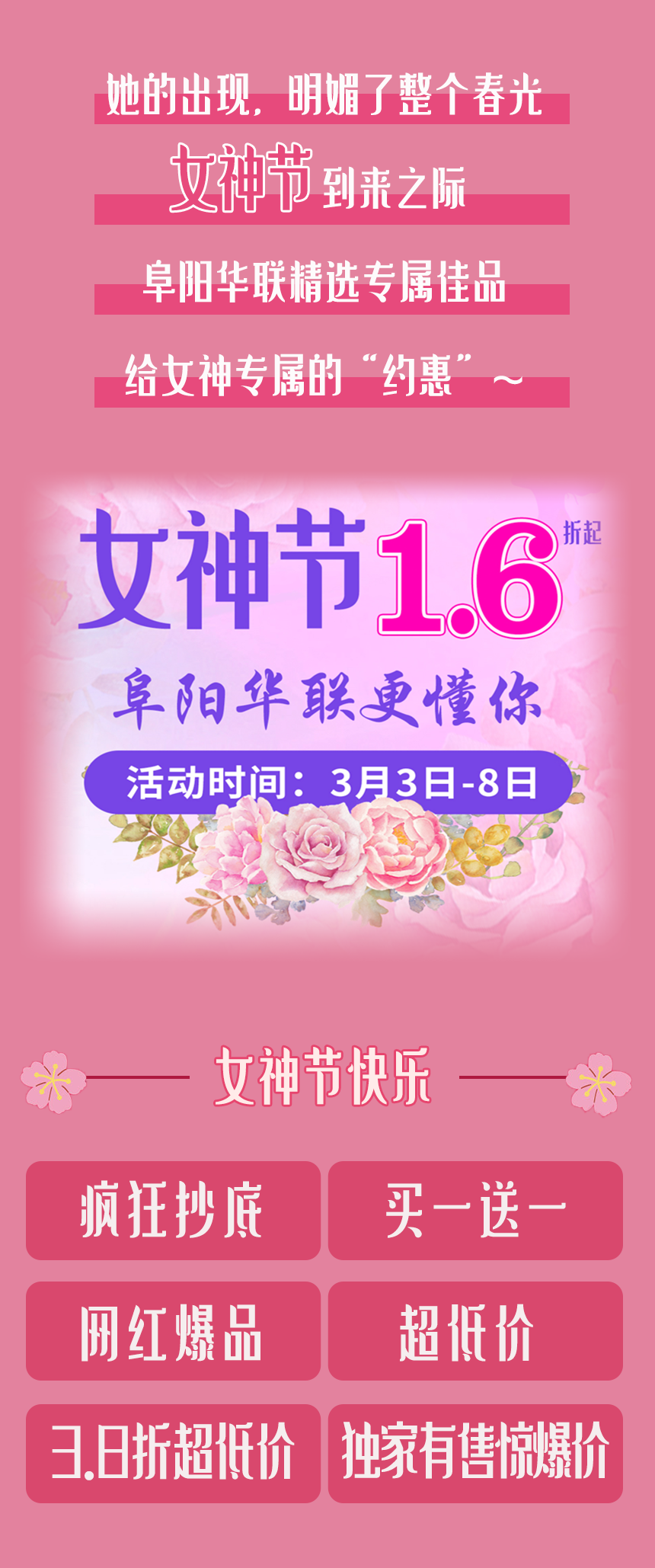 【1.6折起】阜陽(yáng)華聯(lián)·女神節,瘋狂抄底獨寵你~